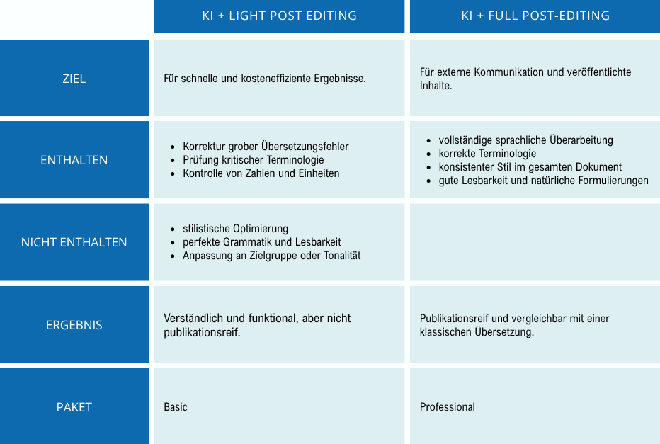 Unsere KI-Übersetzungen bieten wir in zwei Qualitätsstufen an: